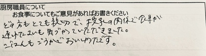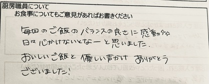 入院が長かったので、たくさんスタッフの方に関わって頂き、皆さん親切にして下さったのでとても感謝しております。ありがとうございました。