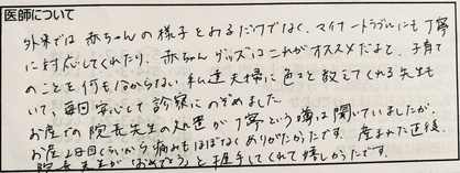 外来では赤ちゃんの様子をみるだけでなく、マイナートラブルにも丁寧に対応してくれたり、赤ちゃんグッズはこれがおススメだよと、子育てのことを何も分からない私達夫婦に色々と教えてくれる先生もいて、毎回安心して診察にのぞめました。お産での院長先生の処置が丁寧という噂は聞いていましたが、お産2日目くらいから痛みもほぼなく、ありがたかったです。産まれた直後、院長先生が「おめでとう」と握手してくれて嬉しかったです。