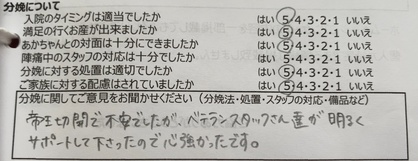 帝王切開で不安でしたが、ベテランスタッフさん達が明るくサポートして下さったので心強かったです。