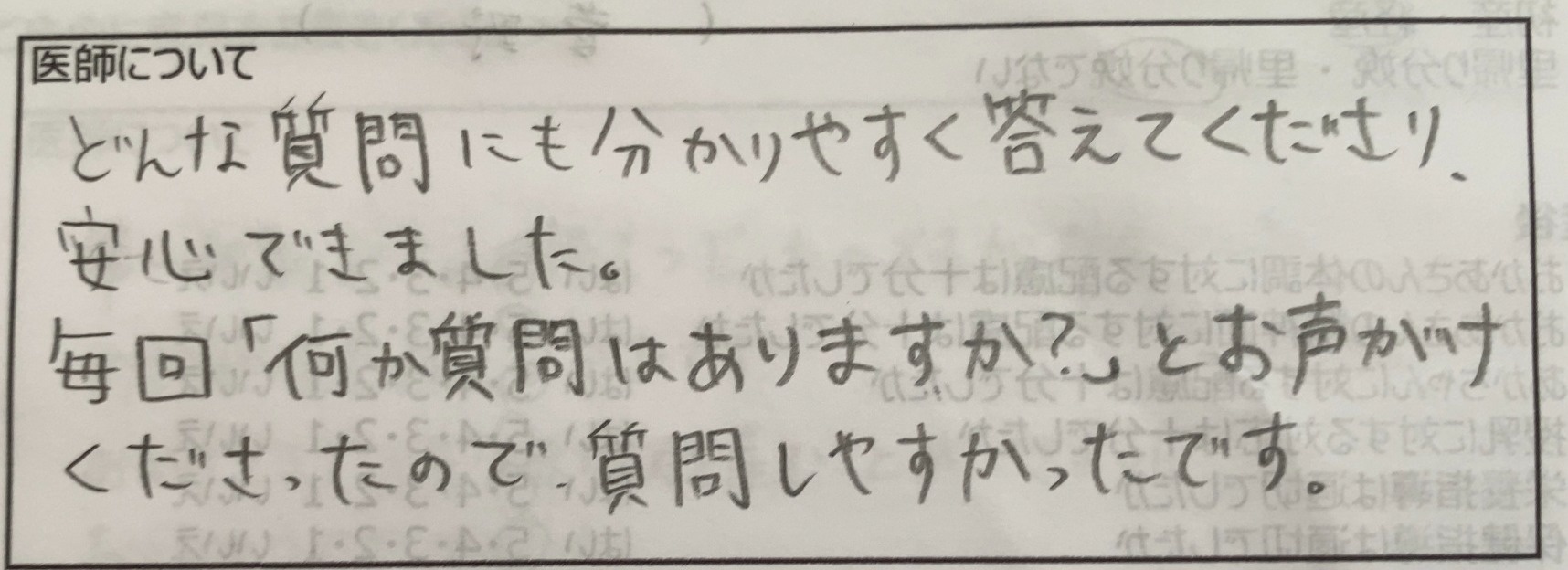 2024年7月のアンケートにお書きいただいた、患者さまからの感想、ご意見です。