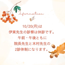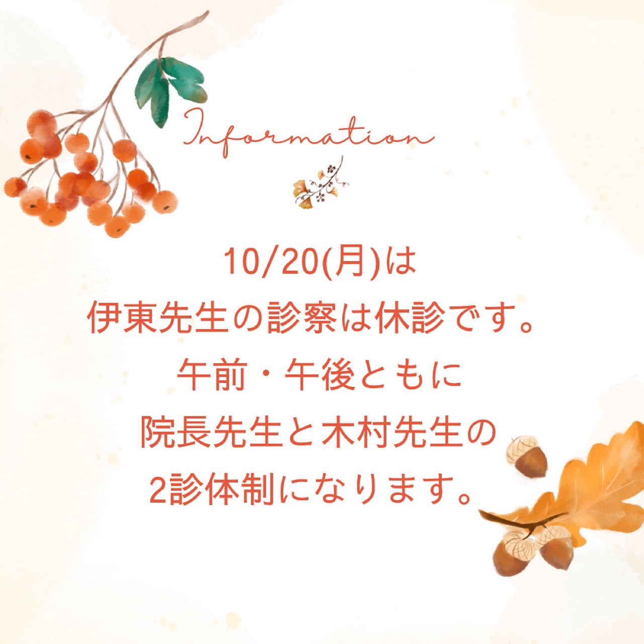 【休診のお知らせ】 10/20(月)の伊東先生の診察は休診です。 午前・午後ともに院長先生と木村先生の 2診体制になりますのでご了承ください。