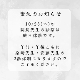10/23(木)の院長先生の診察は休診です 【緊急のお知らせ】 明日10/23(木)の院長先生の診察は 終日休診となります。 午前・午後ともに 桑崎先生・安藤先生の2診体制になります。 急なお知らせで申し訳ございませんが ご了承ください。