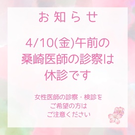 【休診情報】 4/10(金)午前の桑崎医師の診察は休診となります。 女性医師の診察・検診をご希望の方は ご予約の日時にご注意ください。