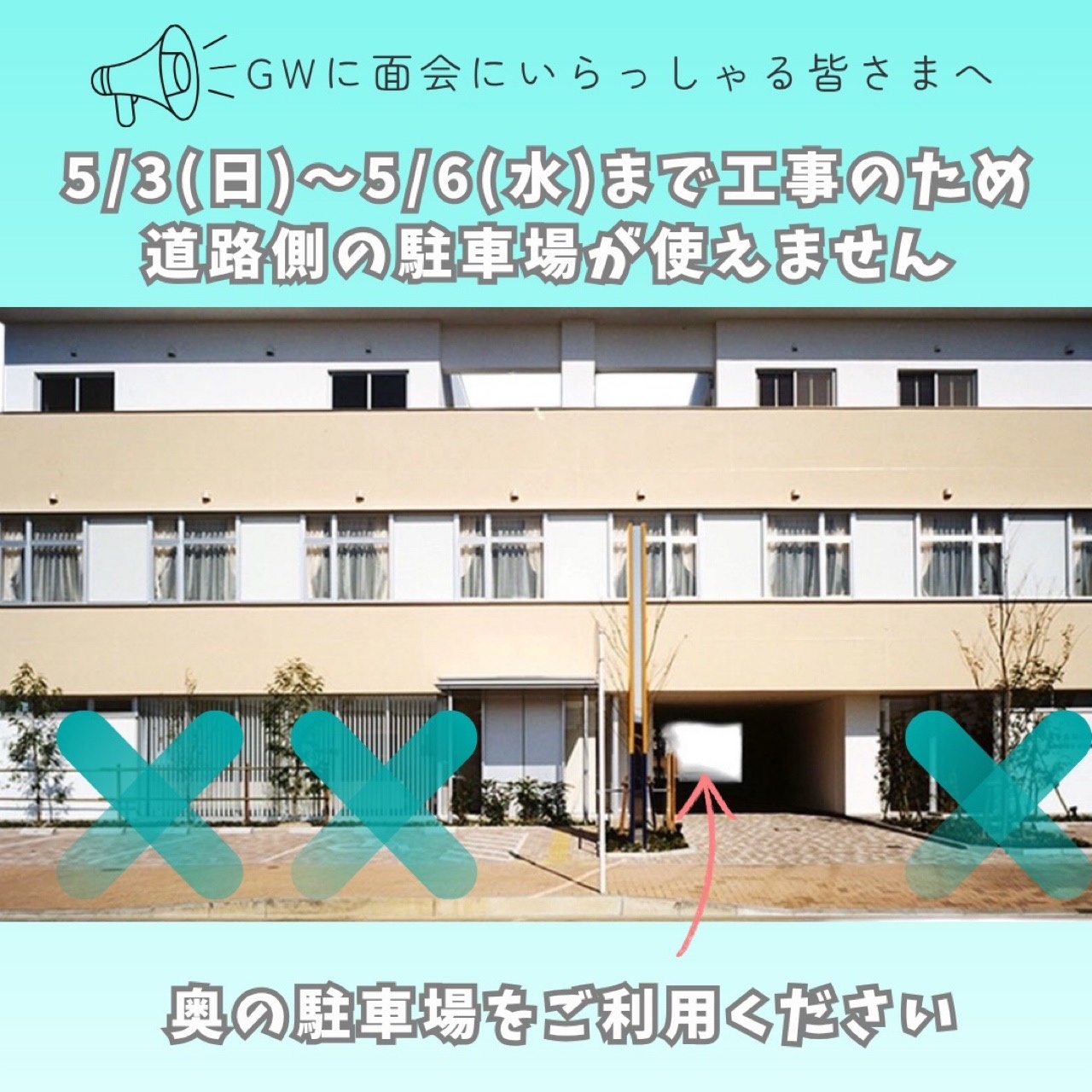 5/3(日)~5/6(水)まで道路前の駐車場は使えません 【GW中にお車でお越しの方へ】 GW中にご面会もしくはお産のため お車でお越しになる方へお知らせです。 5/3(日)~5/6(水)の4日間、 外来工事のため道路側の駐車場が利用できません。 お車でお越しの際は、 当院奥の駐車場をご利用ください。 ご不便をおかけしますが 何卒ご協力お願いします。