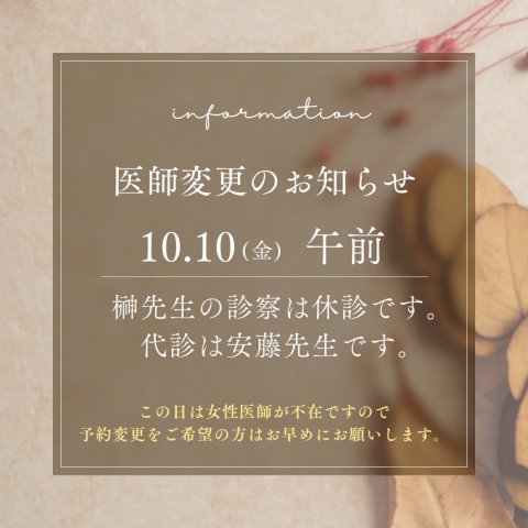 【医師変更のお知らせ】 10/10(金)午前の榊先生の診察は休診となります...