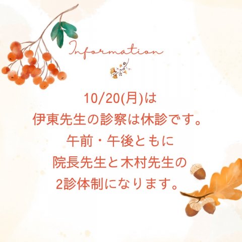 【休診のお知らせ】 10/20(月)の伊東先生の診察は休診です。 午前・午...